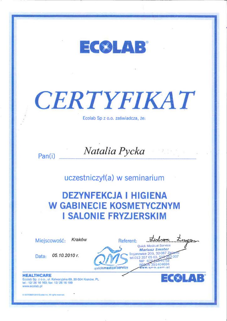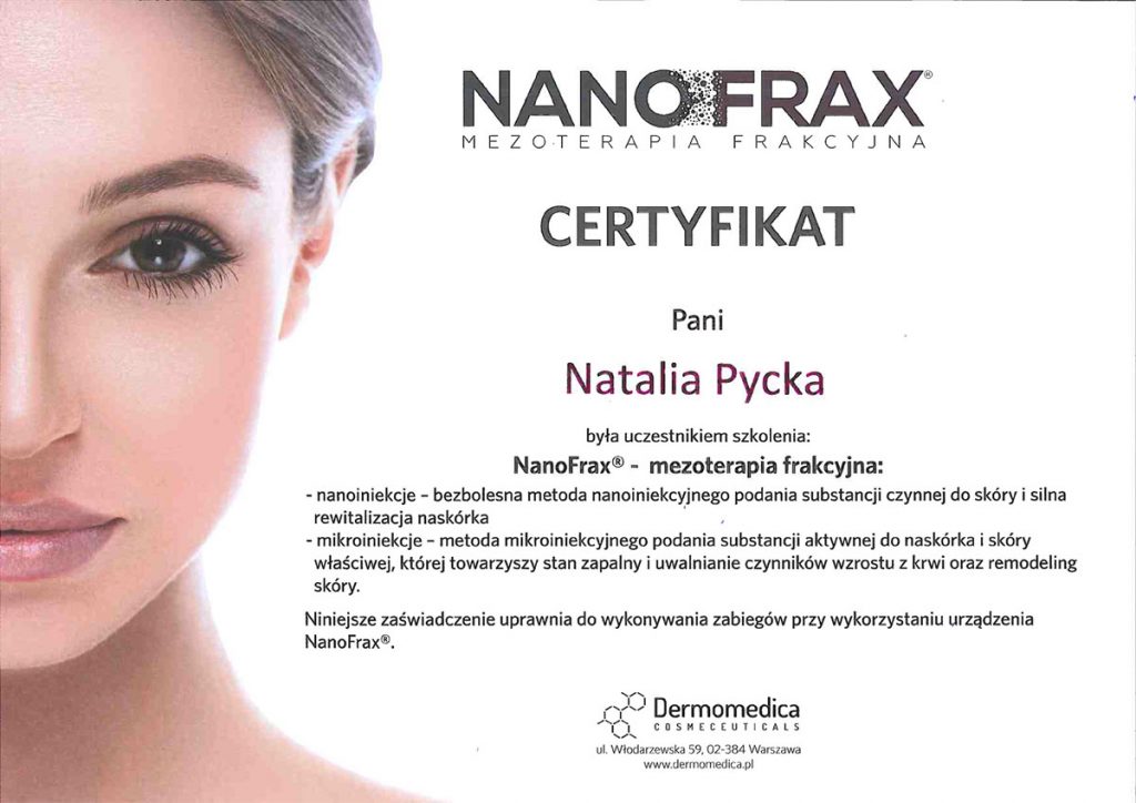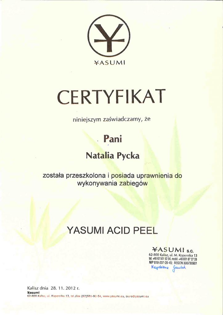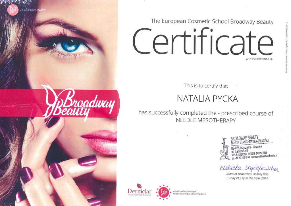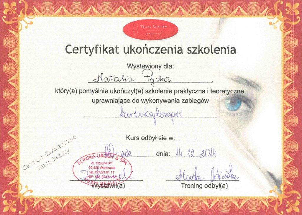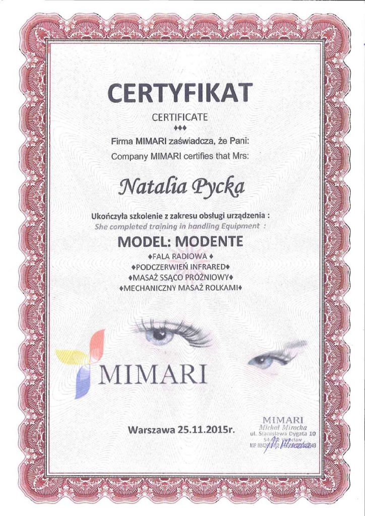 Ukończyła studia wyższe na kierunku – kosmetologia. Od ponad 10 lat wykonuje zabiegii depilacji laserowej. Specjalizuje się również w rozwiązywaniu problemów skóry takich jak trądzik czy rumień. Zeszczególną dbałością podchodzi do każdego wykonywanego zabiegu. W pracy najważniejsze są dla niej serdeczny kontakt z ludźmi i indywidulne podejście do każdego problemu.
