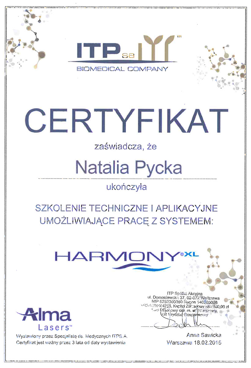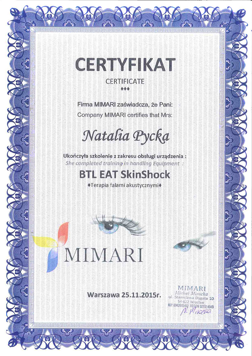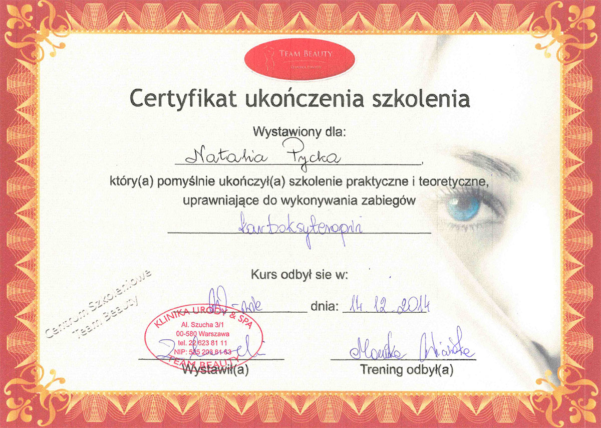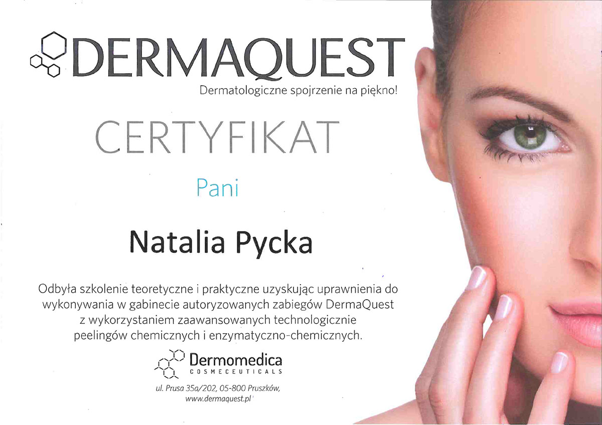 Ukończyła studia wyższe na kierunku – kosmetologia. Od ponad 10 lat wykonuje zabiegii depilacji laserowej. Specjalizuje się również w rozwiązywaniu problemów skóry takich jak trądzik czy rumień. Zeszczególną dbałością podchodzi do każdego wykonywanego zabiegu. W pracy najważniejsze są dla niej serdeczny kontakt z ludźmi i indywidulne podejście do każdego problemu.